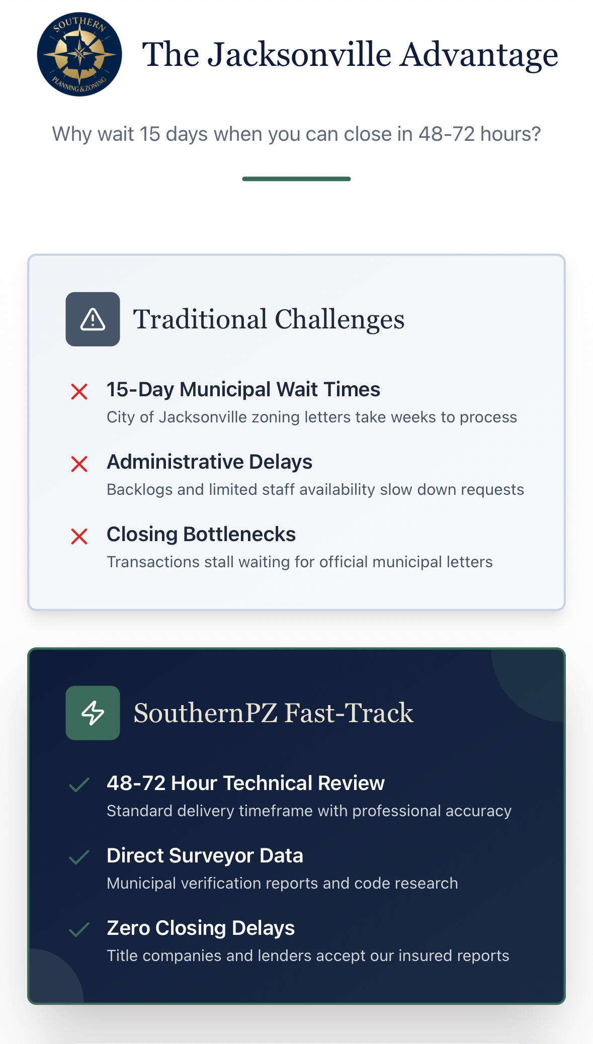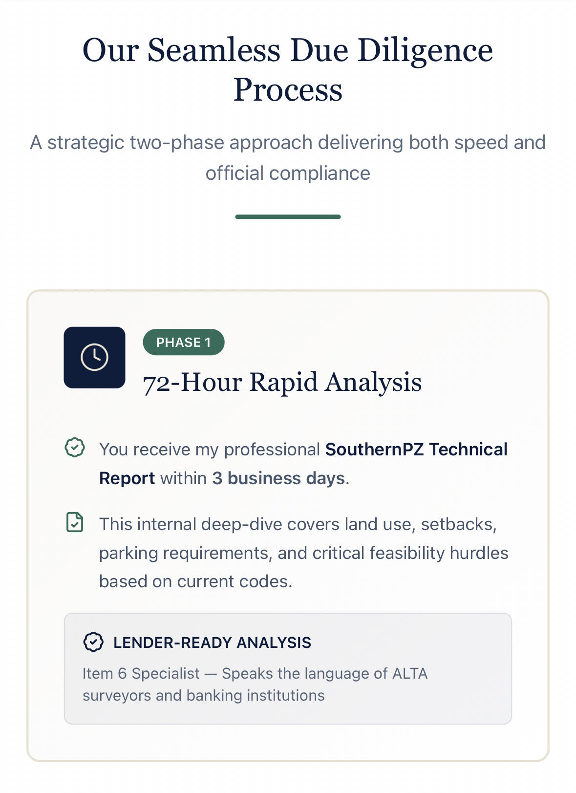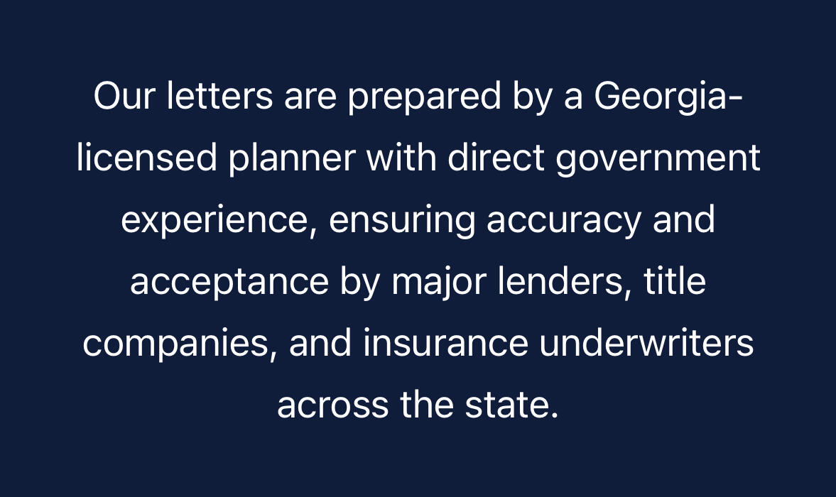 Independent zoning and code-compliance letters for commercial lenders, SBA lenders, and title companies across Georgia.